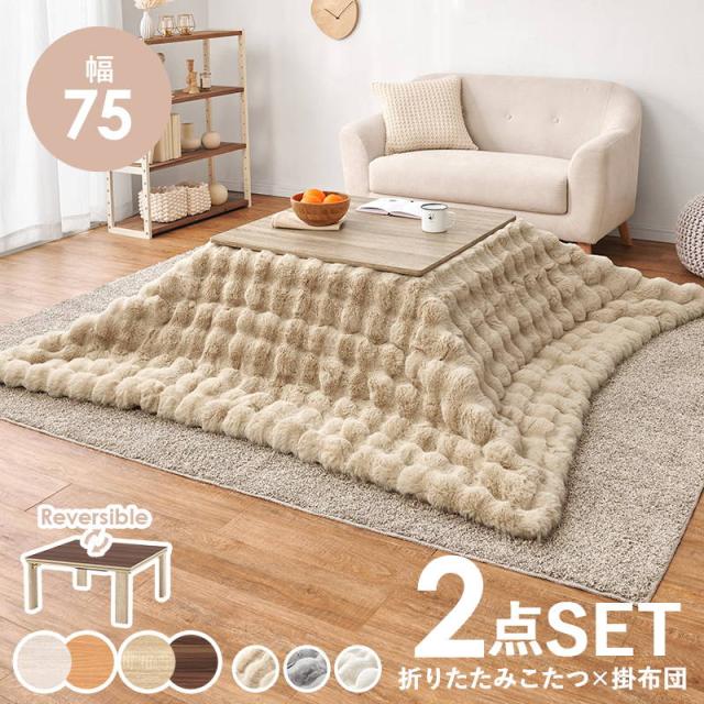 こたつセット 正方形 75x75cm 1人用 折りたたみ リバーシブル天板 洗える ふわとろラビットファー調 こたつ布団 2点セット