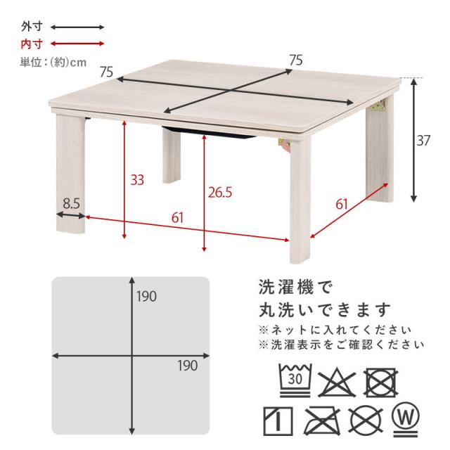 サイズ(約):こたつ:(約)幅75×奥行75×高さ37cm、掛ふとん:(約)190×190cm