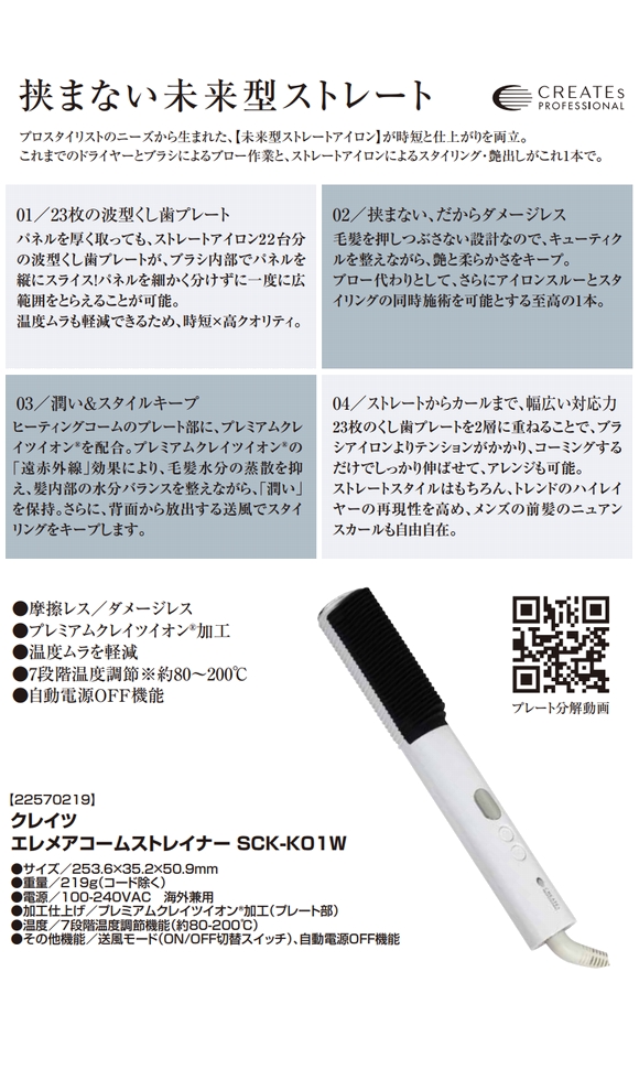 | 商品名 | クレイツ ストレートアイロン コームストレイナー SCK-K01W JAN:4988338223444 |