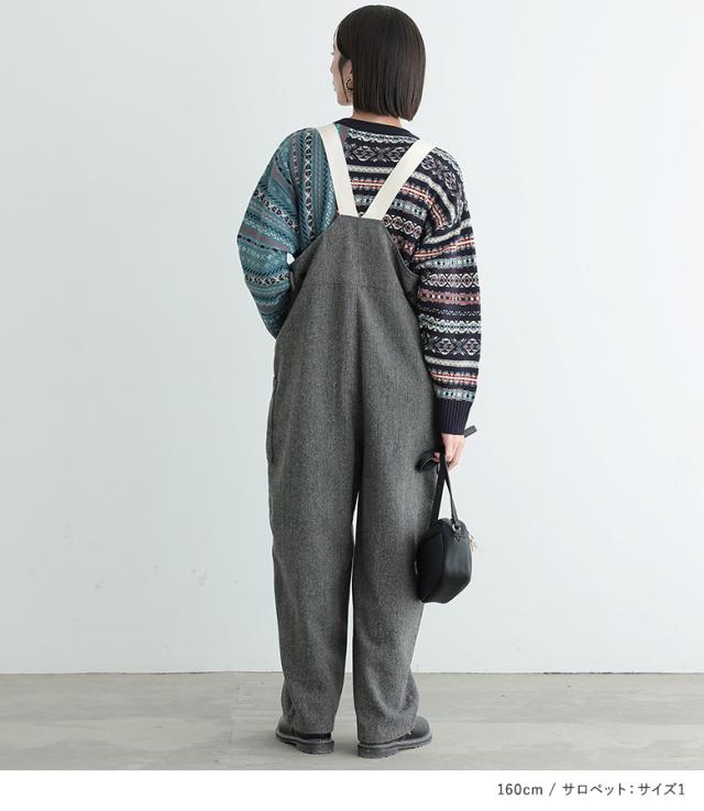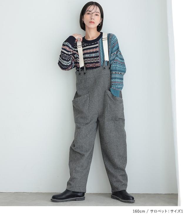【送料無料】『ミックスジャカードニット×ツイードコクーンサロペットコーデ2点SET』【メール便不可】【40】[2点コーデセット 2025 レディース ニット 長袖 クルーネック セーター サロペット ロング オールインワン バルーン]