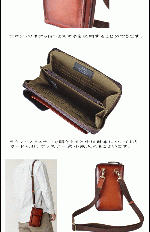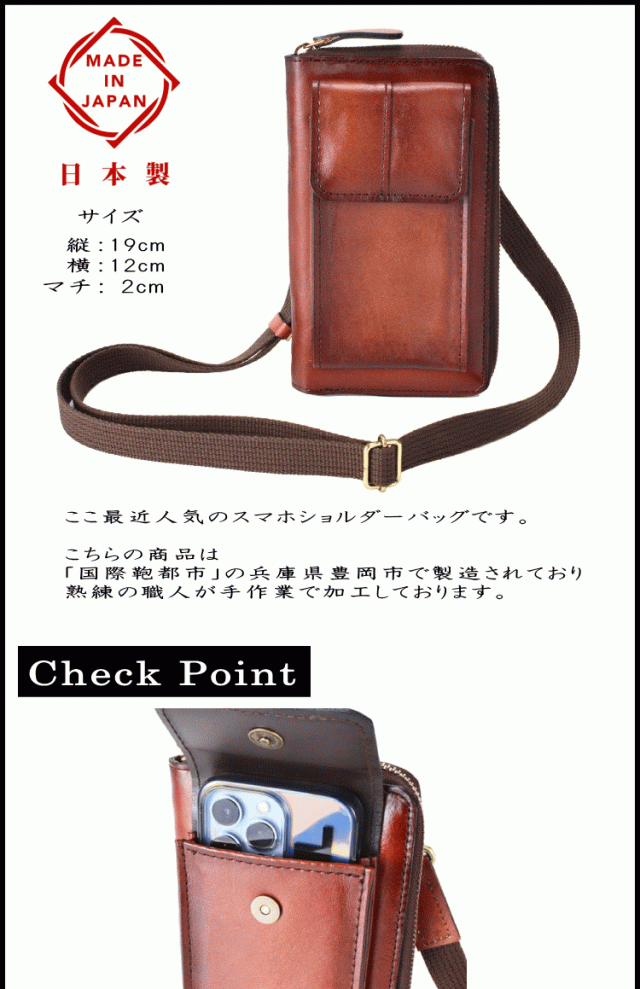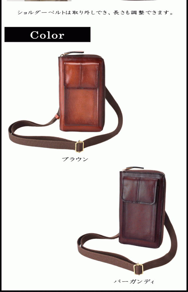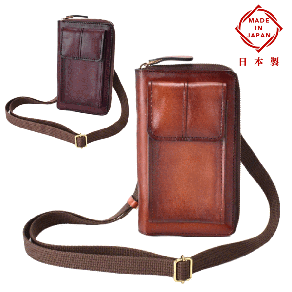 スマホショルダーバッグ 1511 日本製 スマホケース スマホポーチ ラウンドファスナー財布 ブラウン色 バーガンディ色