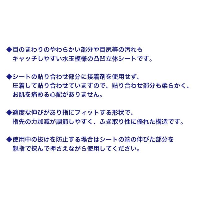 ◆適度な伸びがあり指にフィットする形状で、指先の力加減が調節しやすく、ふき取り性に優れた構造です。