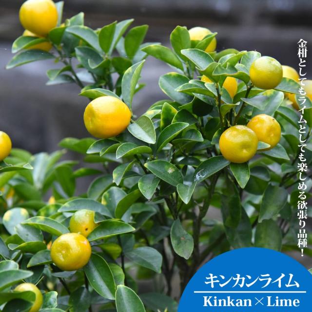「キンカンライム」は、その名の通り金柑とライムの交雑種です。果実の大きさは金柑と同じくらいで、ライムの味がします。涼しくなるにつれて果実が黄色く色づきライム風味の金柑を楽しめます。青実のまま早めに収穫すれば、ライムとしても楽しめます。