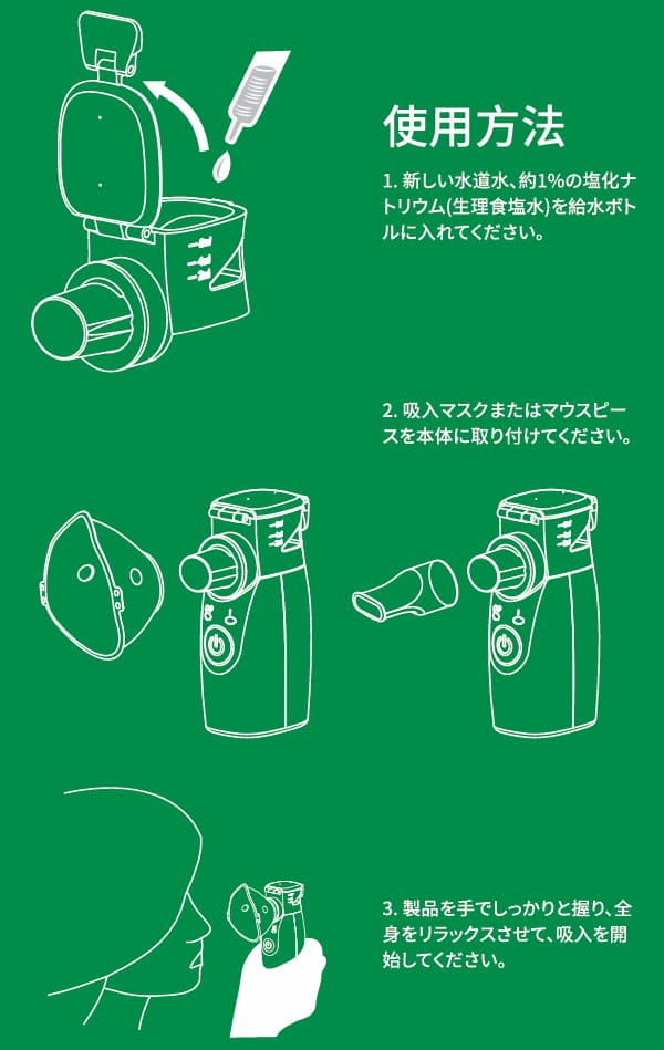 【動作原理】メッシュ式【セット内容】本体、給水ボトル+保護キャップ、吸入マスク、マウスピース、収納ポーチ、単三アルカリ乾電池(お試し用2本)、取扱説明書(保証書付)【サイズ(約)】70×40×114mm【重量(約)】90g(本体+給水ボトル)【保証期間】1年間(本体のみ)【一般名称】家庭用超音波吸入器【医療機器認証番号】306AKBZX00013000(一般医療機器)【区分】中国製・医療機器【メーカー(製造)・輸入者名】株式会社NAPIO CARE JAPAN