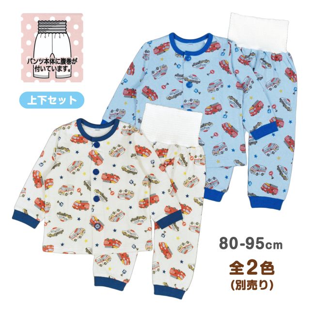 ニットキルト 緊急自動車 総柄 腹巻き付き 長袖パジャマ 。