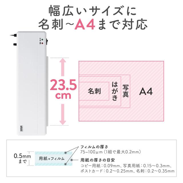 ⇒ご購入の前にご確認下さいウォームアップ時間はわずか90秒で使用できるラミネーター。2本ローラーを採用し、A4サイズから名刺サイズまで幅広く対応。詰まったフィルムが取り出せるリリースレバー搭載。【WEB限定商品】