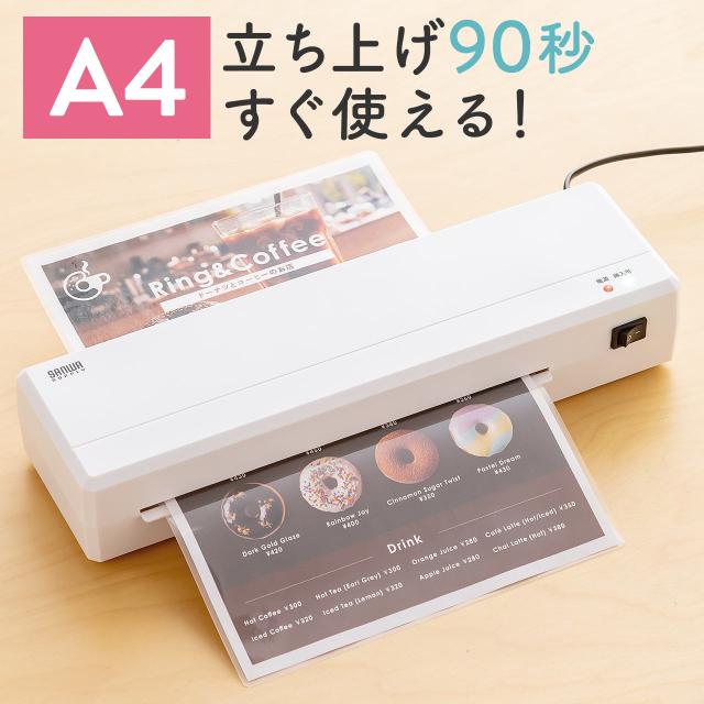 ラミネーター A4 2本ローラー 90秒ウォームアップ パウチ加工 ラミネート 機械 パウチラミネーター スリム 業務用 家庭用 リリース機能[400-LM014]