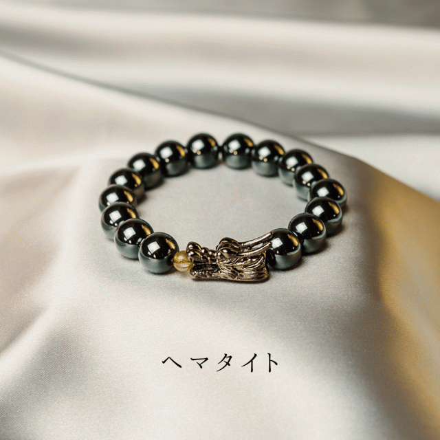 力強く天へ昇る龍が、金運を象徴するルチルクォーツ(金針水晶)をくわえ、持ち主に幸福と繁栄をもたらす姿を表現しています。深みのあるメタリックな輝きのヘマタイトは邪気を払い、勇気と安定を与える守護石。龍神の加護を宿し、開運・成功・金運アップ・厄除けのお守りブレスレットとしておすすめです。