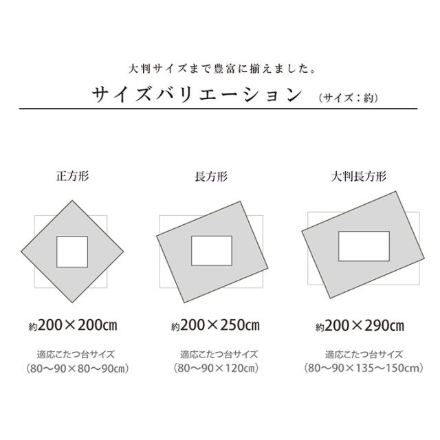 | 表地=ポリエステル100% 裏地=ポリエステル100% 中材=ポリエステル100% (200×200cm:1.3kg/ 200×250cm:1.7kg / 200×290cm :1.9kg)" |