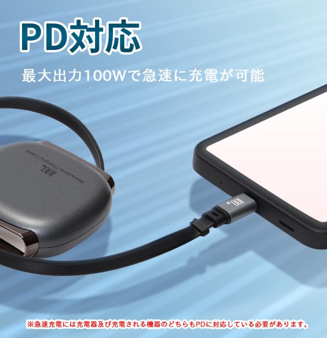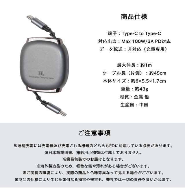 充電ケーブル Type-C to Type-C 急速充電 100W PD対応 タイプC 自動 巻き取り コンパクト スマホ タブレット PC 充電