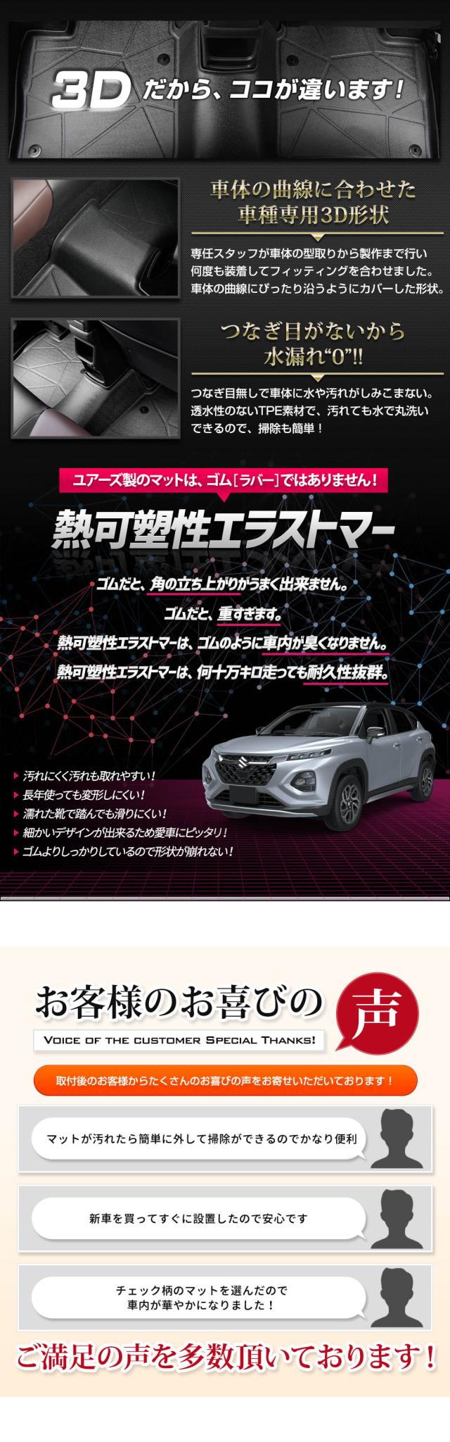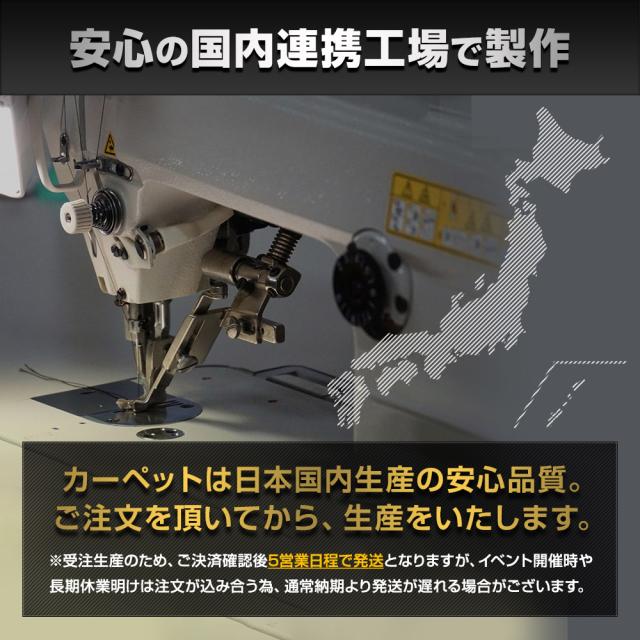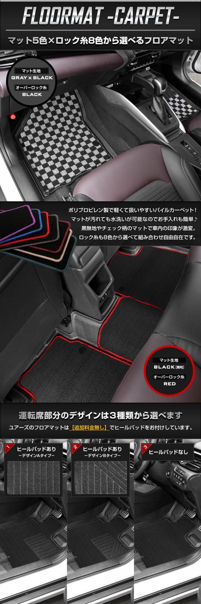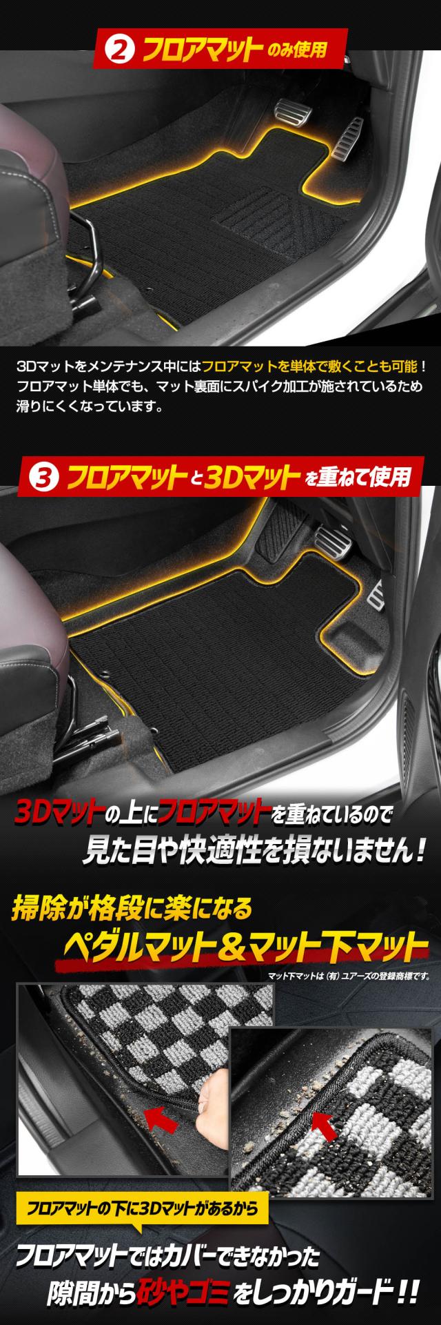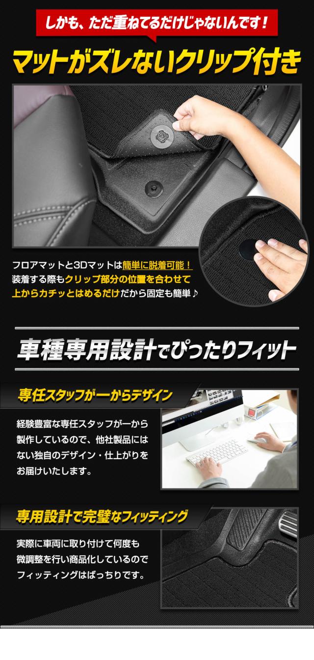 | 商品詳細 | ご要望の多かった3Dマットとカーペットタイプのフロアマットのセットがついに商品化! お掃除のしやすい3Dマットに、マットやロック糸のカラーをカスタマイズできるカーペットタイプのフロアマットを重ねられる完全無欠のマットセットです。 既存のマットをただ重ねただけじゃなく、フロアマットと3Dマットがズレないように専用クリップを取付けました。 簡単に脱着可能なので、フロアマットの取り外しも簡単♪ フロアマットではカバーしきれなかった砂やゴミも3Dマットがしっかりキャッチ! 車の形状にぴったりフィットして、車体への汚れや傷をしっかりカバーします。 ■フロアマット—カーペットタイプ— 軽くて扱いやすいポリプロピレン製のパイル生地カーペット。 汚れても手洗いで水洗いが出来るからお手入れ簡単♪※機械洗いはNG 主張を抑えたシンプルな黒(無地)とオシャレなチェック柄のマットをご用意! 縁のロック糸のカラーも8色から選べるようになりました。 車内の雰囲気がガラリと変わってイメージチェンジにも♪ 運転席部分には追加料金なしで、2種類から選べるヒールパッドをお付けするオプションもご用意しております。 ■カーペットタイプのフロアマットは安心の国内提携工場にて製造 国内の提携工場にて熟練の職人が手作業で製作しています。 安価な商品には無い仕上がりをお届けいたします。 ■3Dマット—ペダルマット/マット下マット— どの部位のマットもフロアをスキャンして製作しているのでピッタリフィット! 車体にあった形状で、汚れや水から車内をしっかりカバーしてくれます。 車内のゴミや砂をガッチリガード!! ・隙間なくフィットするので、ゴミや砂が直接車両床に落ちることはありません。 ・3Dデザインなので縁の数センチの立ち上がりで水や汚れをしっかりキャッチ! 完全防水なのでお手入れも簡単! ・水や汚れは軽いものならウエスなどで拭くだけでOK! ・全面的に汚れた場合は丸洗いも可能なので衛生的です。 新素材の熱可塑性エラストマー(TPE)を使用。 ・弾力があり、曲げたりすることも可能なので、お車からの取り外しも容易です。 ・ゴムのように車内が臭くなりません。 ・耐久性抜群なので何十万キロ走っても大丈夫です。 |