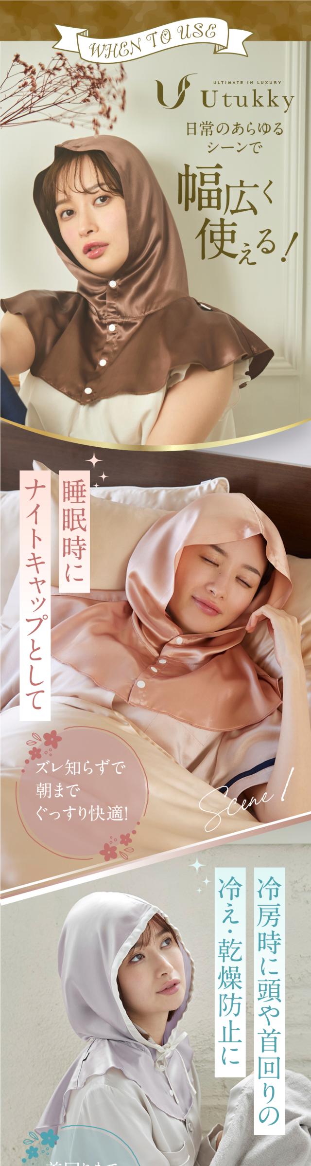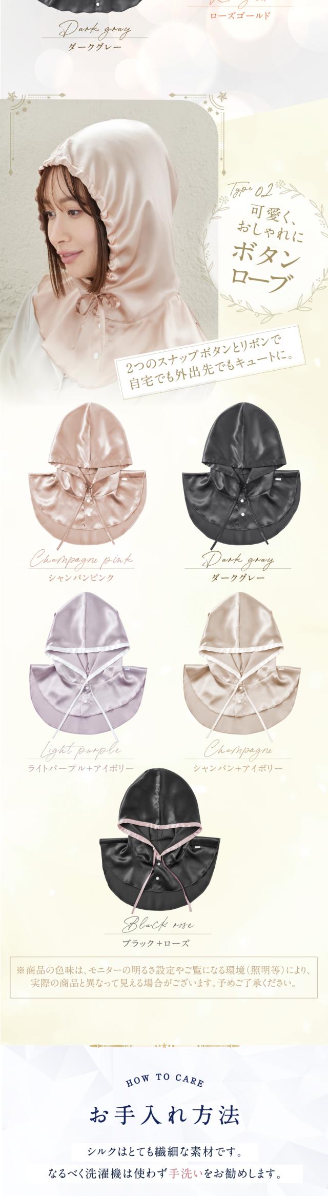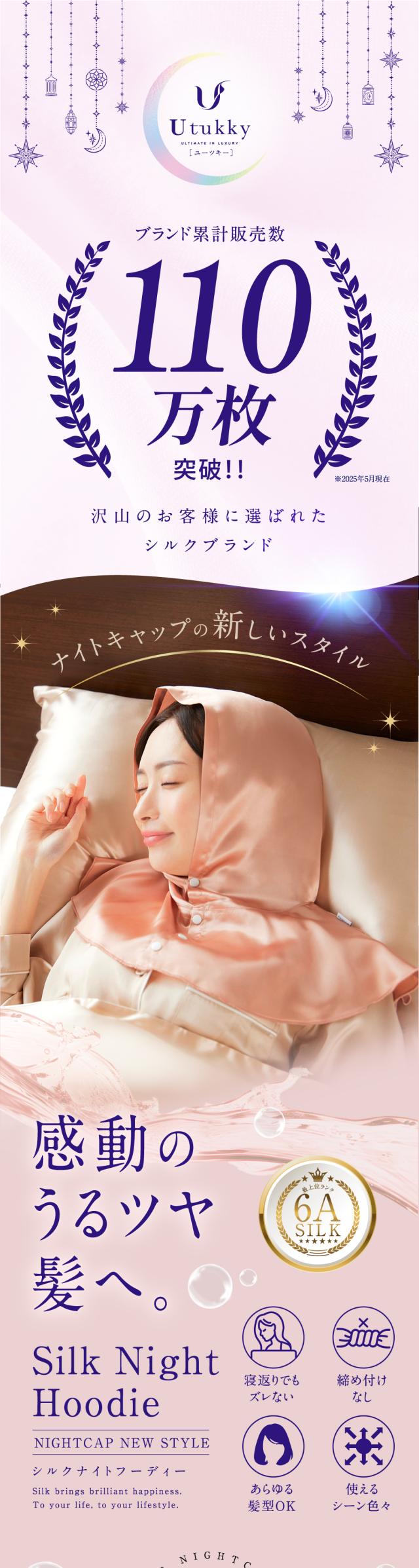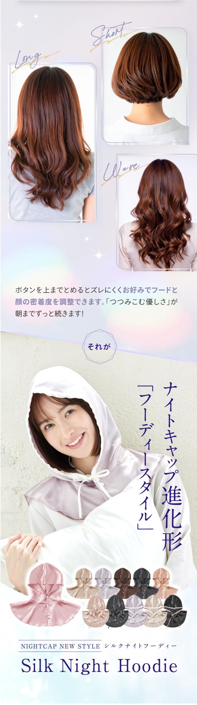 ・寝ている間に美髪ケア——摩擦・乾燥から髪を守る シルクは、人の髪と同じタンパク質由来の天然素材。寝返り時の摩擦を抑え、枝毛や切れ毛、パサつきを防ぎます。 ナイトフーディは、頭部全体をやさしく包み込み、寝ている間も髪のうるおいを逃しません。朝起きたときの「まとまり感」と「つや感」が違います。 ・フードデザインで“朝までずれない・脱げない” 従来のナイトキャップと違い、ゆったりとしたフード型デザインを採用。 頭をふんわりと包み込みながら、ボタン/紐でサイズを自在に調整可能。寝返りを打ってもずれにくく、朝まで快適にフィットします。 ・首元までカバーする美容設計——乾燥・冷え対策にも シルク素材のフードが首元までやさしく包み込み、空調の乾燥や冷気から肌をガード。 睡眠中の首の乾燥や肌荒れを防ぎ、翌朝までしっとりとした肌を保ちます。美容と安眠の両方を叶える新発想のナイトウェアです。 ・おうち美容にも外出にも使える多機能デザイン ナイトキャップとしてだけでなく、冷房や冬のネックウォーマーや日焼け止め帽子、休憩時の遮光アイテムとしても使用できる4WAY多用途デザインです。 ・締め付けゼロ・着脱簡単 ゴムを使わず、ボタンとひもでサイズ調整できるので、締めつけ感がなく快適。 長時間着けても跡が残りにくく、髪をまとめる手間もかかりません。被るだけで、朝まで包み込むような優しさが続きます。 |