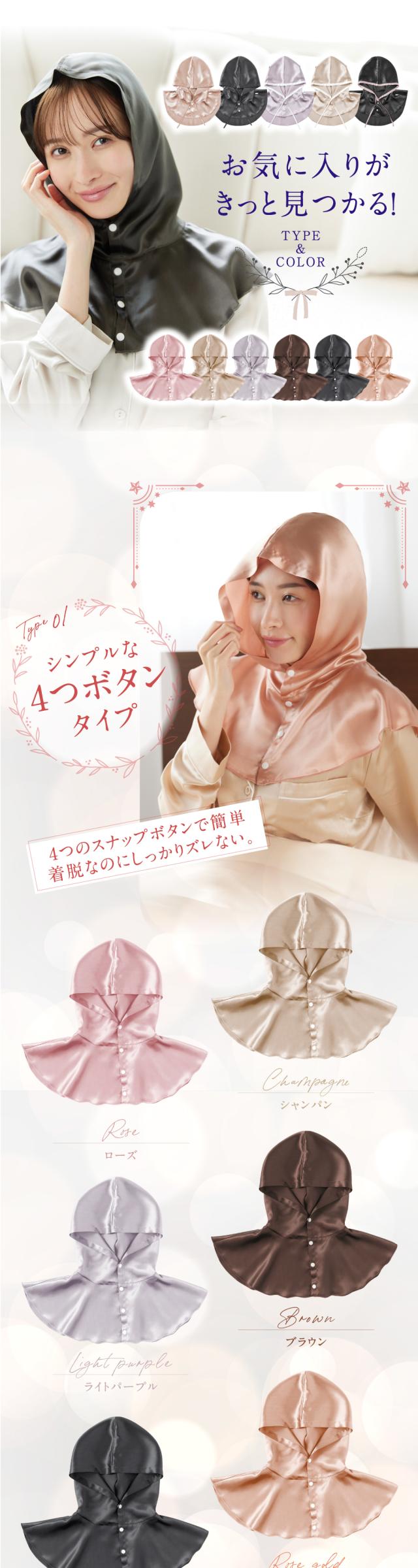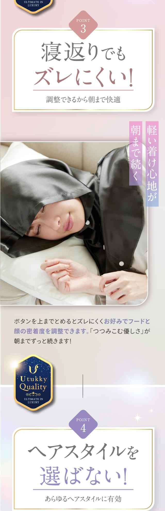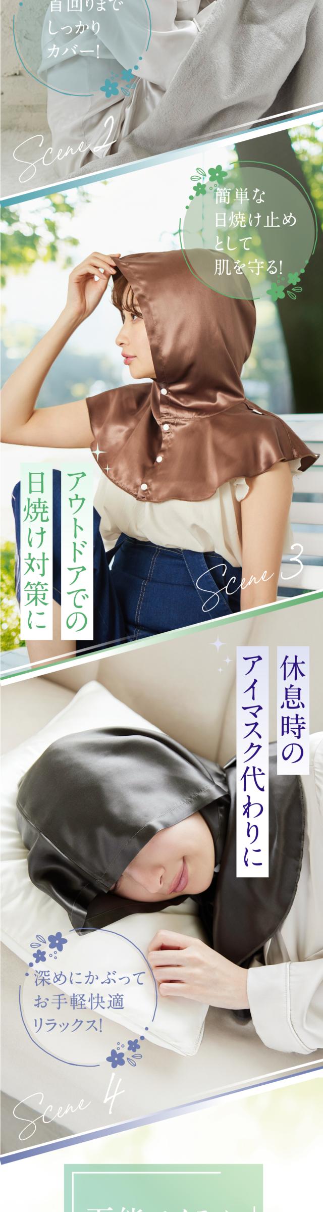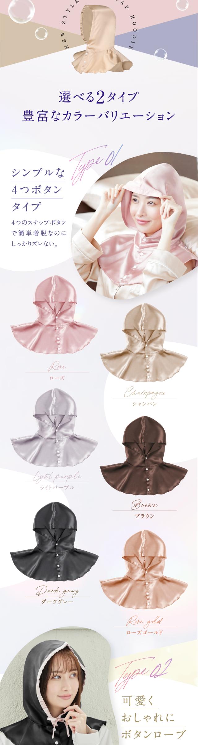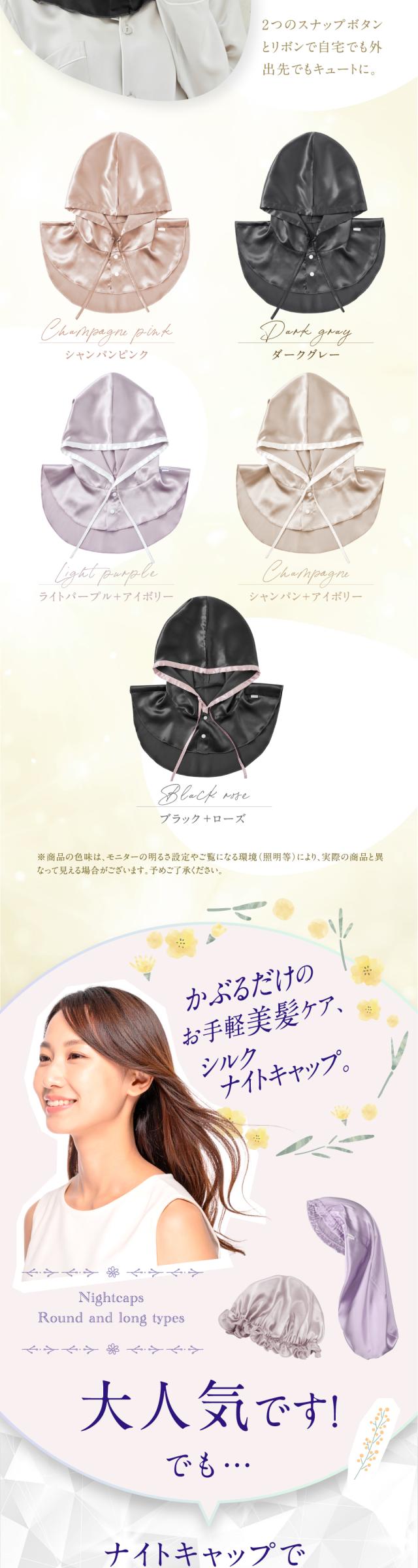 ・寝ている間に美髪ケア——摩擦・乾燥から髪を守る シルクは、人の髪と同じタンパク質由来の天然素材。寝返り時の摩擦を抑え、枝毛や切れ毛、パサつきを防ぎます。 ナイトフーディは、頭部全体をやさしく包み込み、寝ている間も髪のうるおいを逃しません。朝起きたときの「まとまり感」と「つや感」が違います。 ・フードデザインで“朝までずれない・脱げない” 従来のナイトキャップと違い、ゆったりとしたフード型デザインを採用。 頭をふんわりと包み込みながら、ボタン/紐でサイズを自在に調整可能。寝返りを打ってもずれにくく、朝まで快適にフィットします。 ・首元までカバーする美容設計——乾燥・冷え対策にも シルク素材のフードが首元までやさしく包み込み、空調の乾燥や冷気から肌をガード。 睡眠中の首の乾燥や肌荒れを防ぎ、翌朝までしっとりとした肌を保ちます。美容と安眠の両方を叶える新発想のナイトウェアです。 ・おうち美容にも外出にも使える多機能デザイン ナイトキャップとしてだけでなく、冷房や冬のネックウォーマーや日焼け止め帽子、休憩時の遮光アイテムとしても使用できる4WAY多用途デザインです。 ・締め付けゼロ・着脱簡単 ゴムを使わず、ボタンとひもでサイズ調整できるので、締めつけ感がなく快適。 長時間着けても跡が残りにくく、髪をまとめる手間もかかりません。被るだけで、朝まで包み込むような優しさが続きます。 |