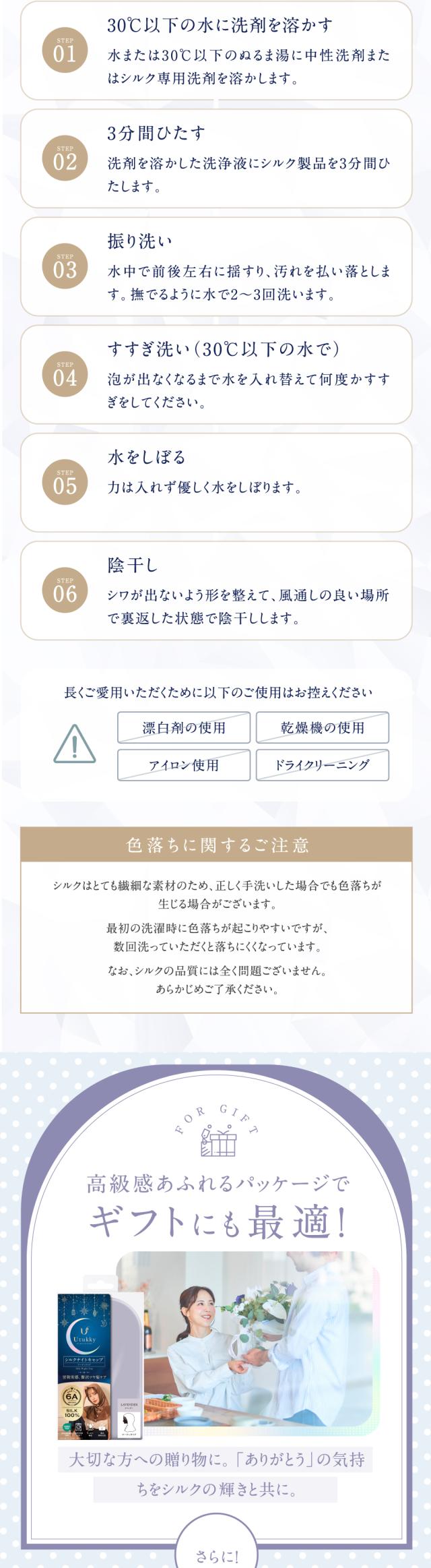 | お手入れ方法 | シルク100%のため、できるだけ手洗いをしてください。 (1)ぬるま湯(30℃以下)に中性洗剤を溶かし、やさしく押し洗いしてください。 (2)洗剤が残らないよう、きれいな水でやさしくすすぎます。 (3)軽く押さえるようにして水気を取り、タオルに包んで軽く水分を吸い取ります。 (4)直射日光を避け、風通しのよい日陰で平干ししてください。 (5)必要な場合は当て布をし、低温(110℃以下)で軽くアイロンをかけてください。 |