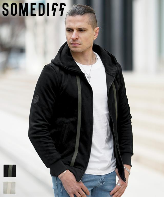 SOMEDIFF(サムディフ)『フェイクスウェードラインパーカー』【フェイクスウェードラインパーカー】■Design/デザイン拘り抜いたデザインが輝くスウェード調の素材を用いたパーカー。フロントに真っすぐ入った同系色のラインが、余計な主張を抑えつつも、違いを出してくれる。体のラインに沿ってデザインされているため、細見え効果も演出する。またバックには同系色の刺繍で大胆にブランドロゴを施すことで、デザイン性をプラスし、洒落感のある仕上がりに。遊び心あるデザインでオトナのパーカーを着こなせ。