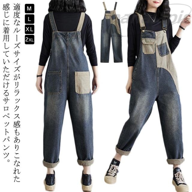 デニム オーバーオール 配色 レディース 低身長 サロペット パンツ 作業着 ツイル デニムパンツ 春 秋 冬 ボトムス デニム オールインワン ロングパンツ 長ズボン 体型カバー 大人 可愛い 30代 40代 50代 Gパン ジーパン 綿 コットン 【送無】