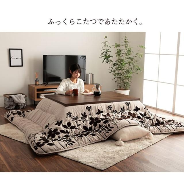 | シンプルなリーフ柄をあしらった商品です。表地には肌触りやわらかなフランネルを使用しました。部分暖房のこたつは電気代もお得です。 |