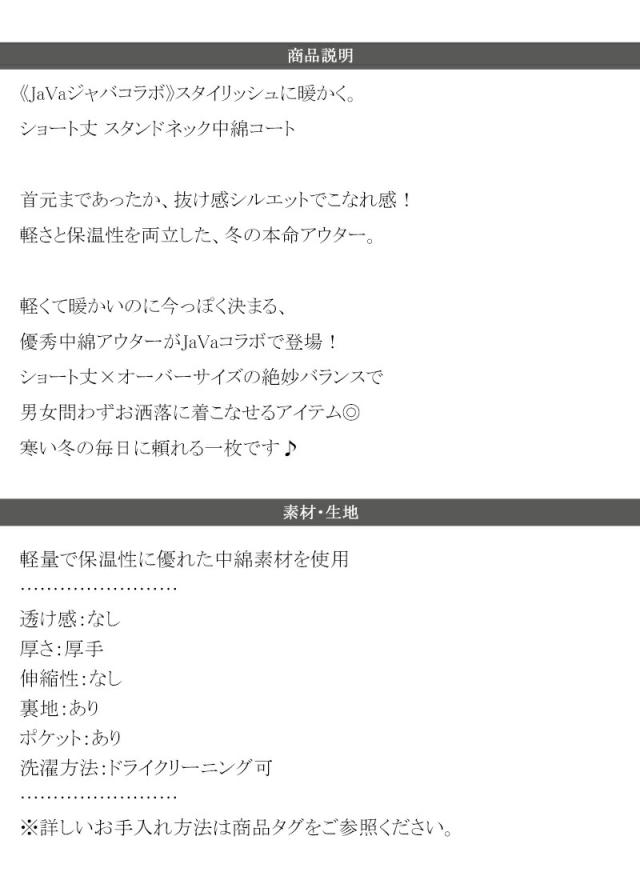 クラシカルエルフ冬新作 java ジャバコラボ ジャケット メンズ 大きいサイズ アウター スタイリッシュ ショート丈 スタンドネック 中綿 コート ブルゾン 男女兼用 ユニセックス レディース 大きいサイズ 2025aw jm1240095
