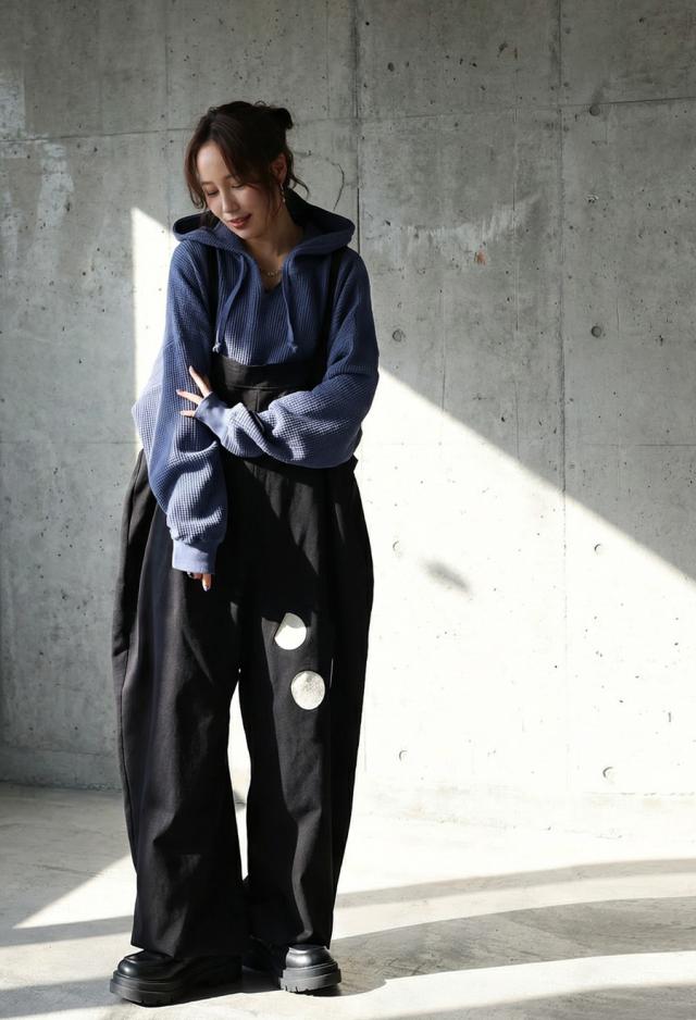 ワイドなシルエットと裾リブの丸みが、体型をふんわりとカバーしつつこなれた印象を与えます。