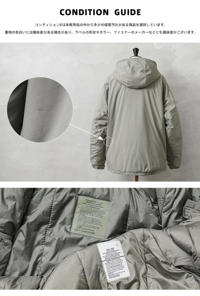 | 商品状態 | 実物新品未使用デッドストック ※コンディションBは未使用品の中から多少の保管汚れがある商品を選別しています。入荷時期によりタグにマジックで線や文字が書いてあるものもございますが、新品未使用品に間違いございません。GEN IIIやプリマロフトのタグがないものも混在しております。裏地の色合いには個体差がある場合があり、ラベルの形状やカラー、ファスナーのメーカーなどにも個体差がございます。商品の状態についてご指定いただくことは出来ませんので予めご了承ください。 | |||||||||||||||||||||||||||||