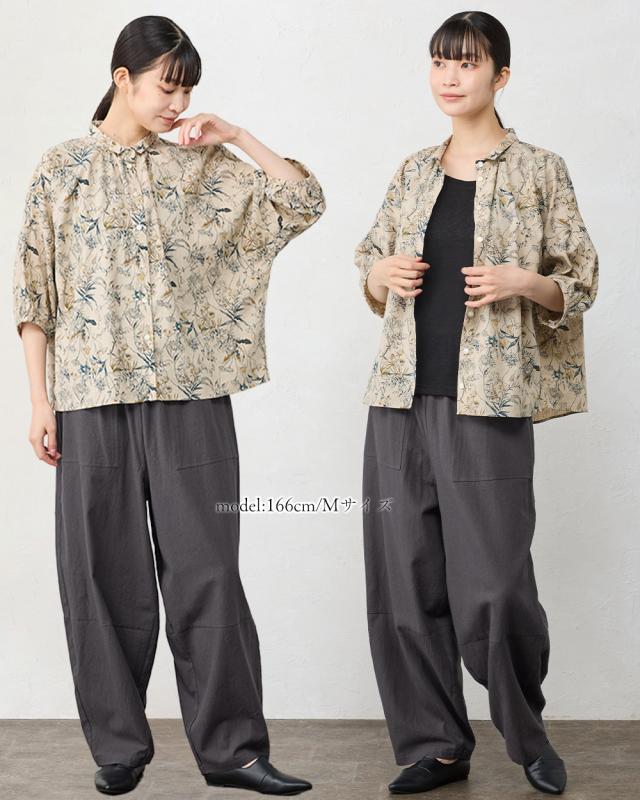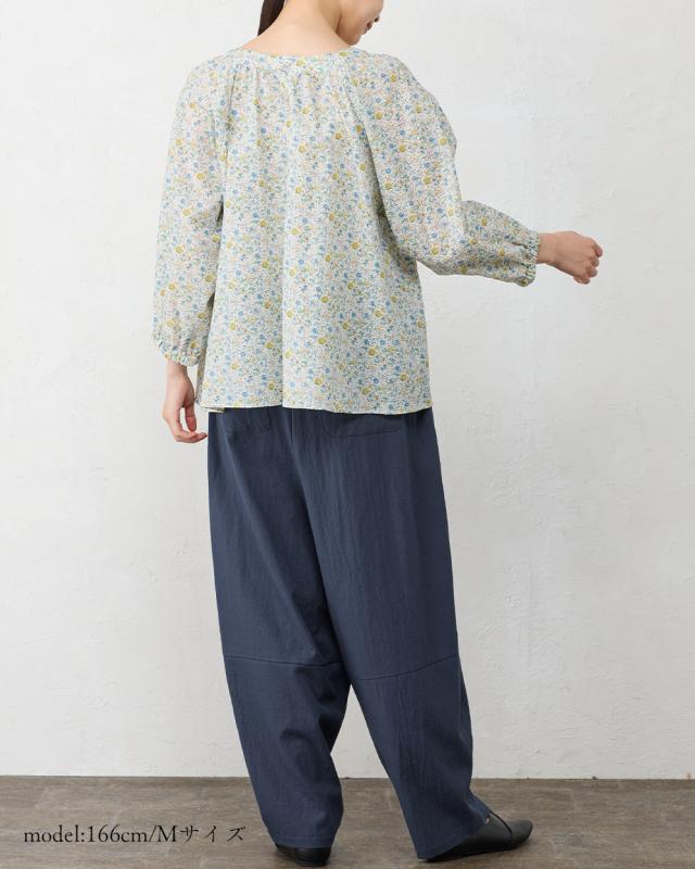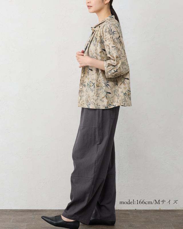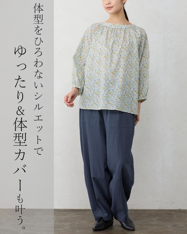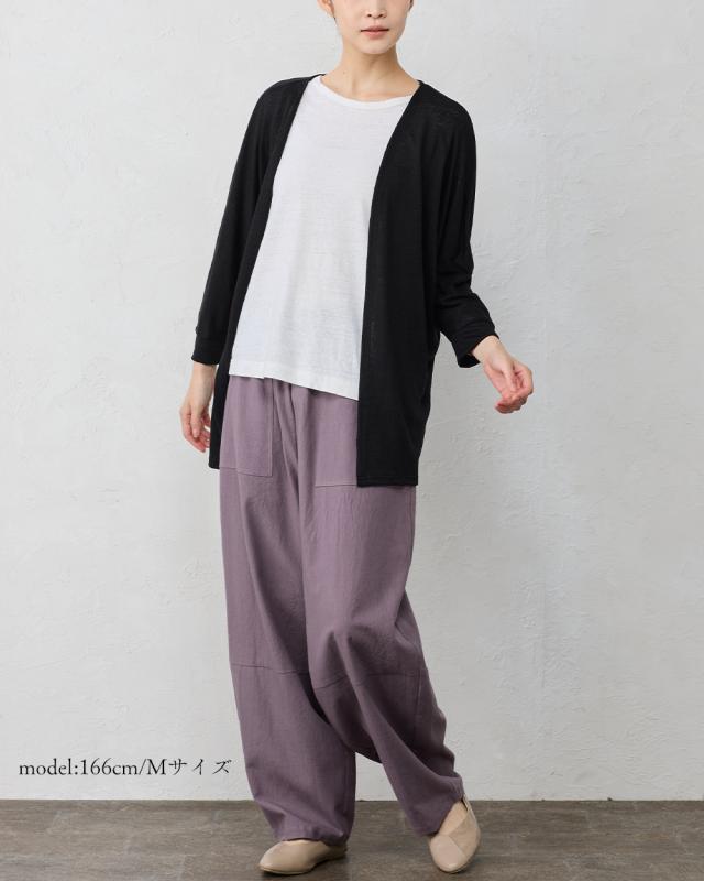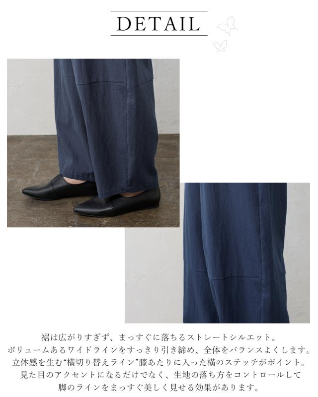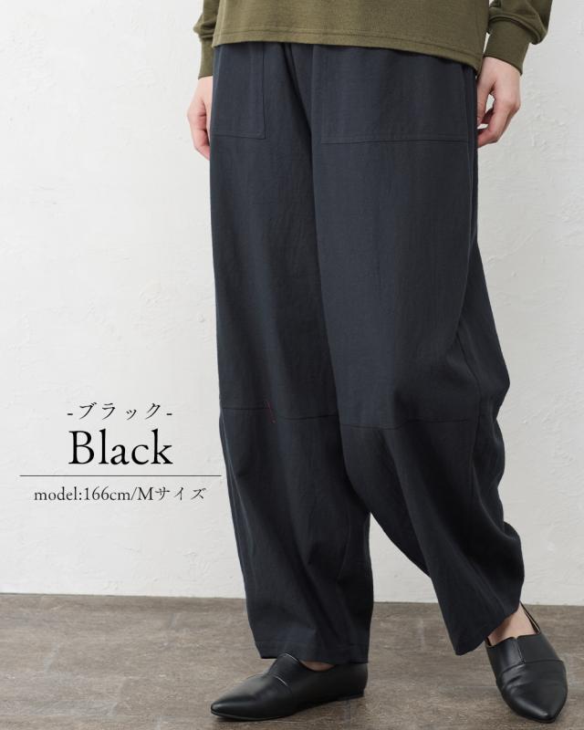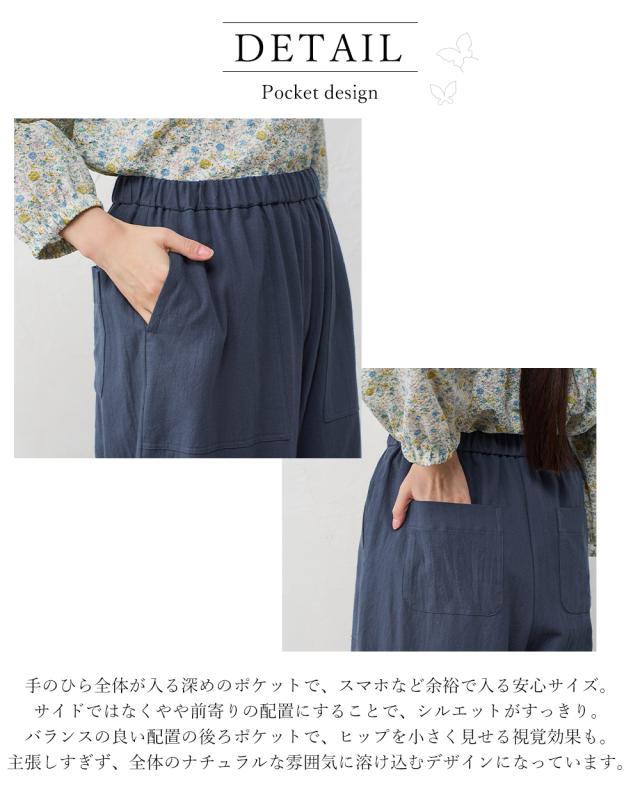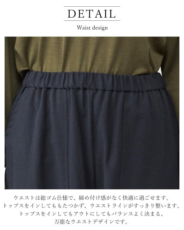 ウエストは総ゴム仕様で、リラックスした穿き心地ながら腰まわりはすっきりとみえるシルエットです。