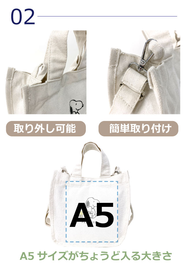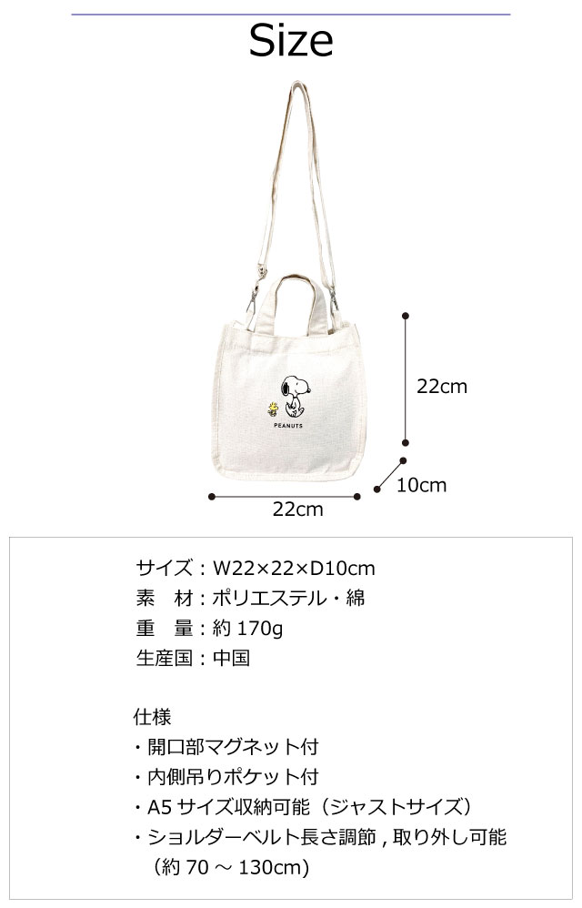 ![]() ![]() ![]() ![]() ![]() ![]() SNOOPY スヌーピー あるく シンプルで大人も使いやすいデザインが特徴です。キャンバス素材で作られたこのバッグは、軽量で持ち運びが簡単です。 A5サイズに対応しており、日常の必需品をしっかり収納できます。2way仕様で、ショルダーバッグとしてもトートバッグとしても使用可能です。 中学生や高校生にもぴったりで、カジュアルなスタイルに合わせやすいアイテムです。