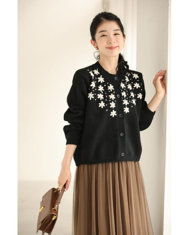 新作10月28日 (黒)降りしきる花雪ニットカーディガン トップス カーディガン レディース ファッション 秋服 冬服 着回し ニット 刺繍 花 cawaii wkj00187 S~2L対応 ブラック 日常使い キレイめ シンプル ミセス 30代 40代 50代