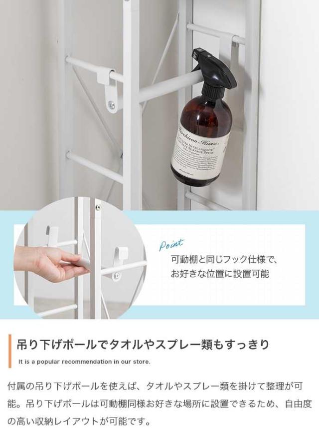 ハイタイプ&可動棚4段と吊り下げポールで、かさばるアイテムもまとめて収納。