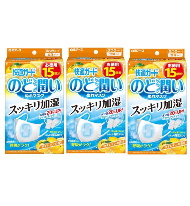 快適ガード のど潤いぬれマスク ゆずレモンの香り ふつう 15回分 ×3 【3個セット】送料無料 白元アース 濡れマスク 加湿
