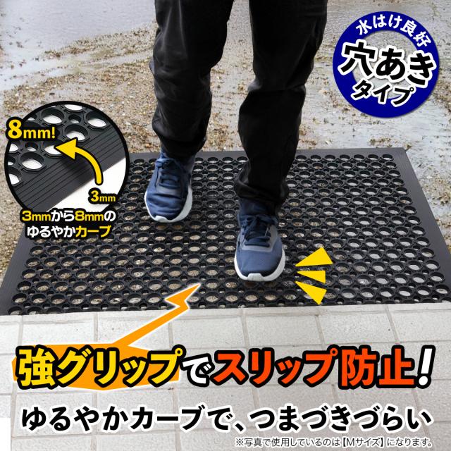 【強グリップでスリップ防止!】『階段の先』や『ぬかるみ』『玄関』等の滑りやすい場所に使えるカーブ付き有孔ラバーマットになります。サイズに合わせたしっかりした重みで安定感があり、つまづきづらい設計の斜めカーブがついており、玄関・ドアマットに最適です。