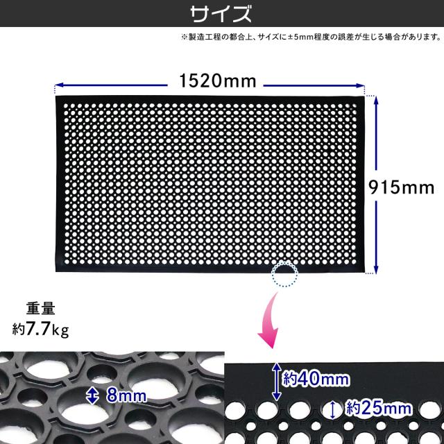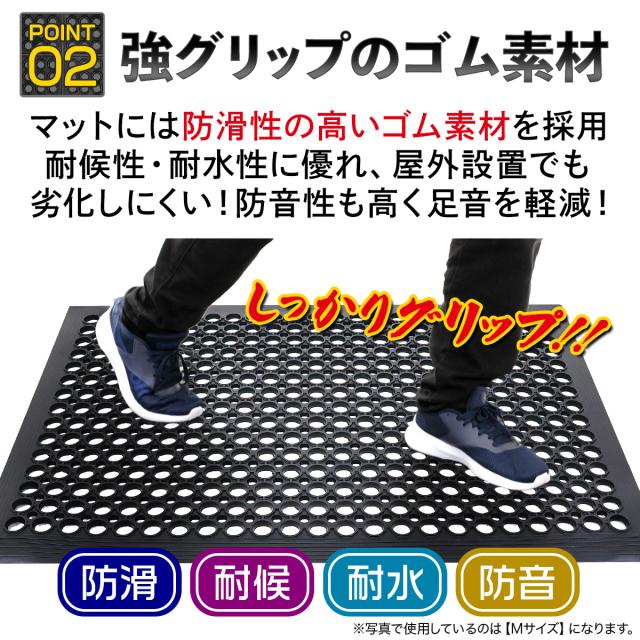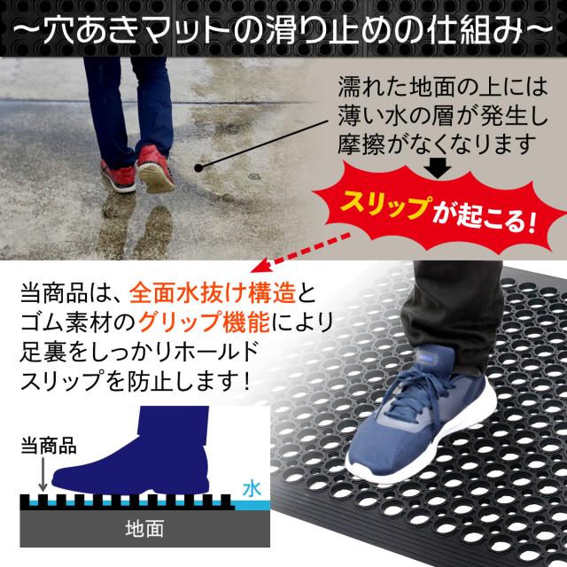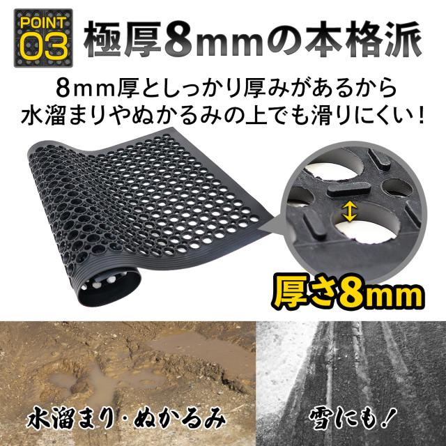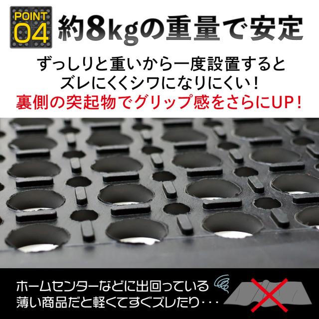 【滑りにくいマットには理由があります】全面水抜け構造で、水によるスリップを防ぎます。また極厚8mmのゴム素材マットはしっかりとグリップが効き、防滑性・耐候性・防水性・防音性に優れています。
