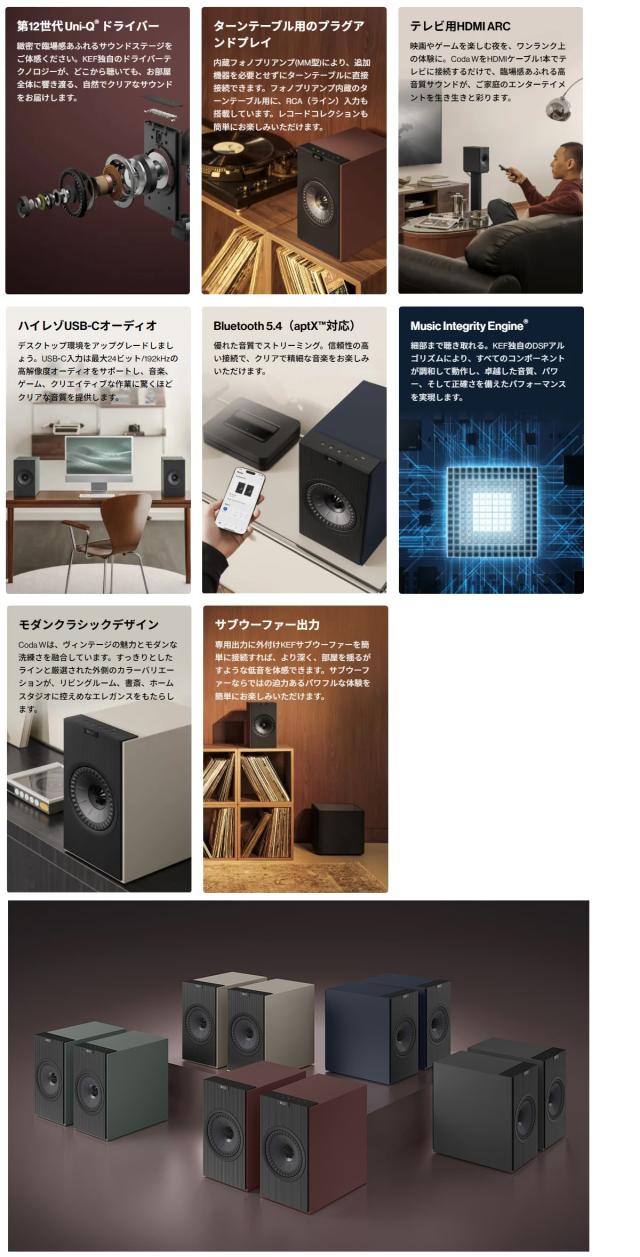 | 同梱内容 | Coda Wスピーカーセット、リモコン、電源ケーブル、スピーカー間ケーブル(3m)、クイックスタートガイド、保証および安全情報 |