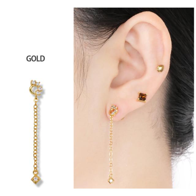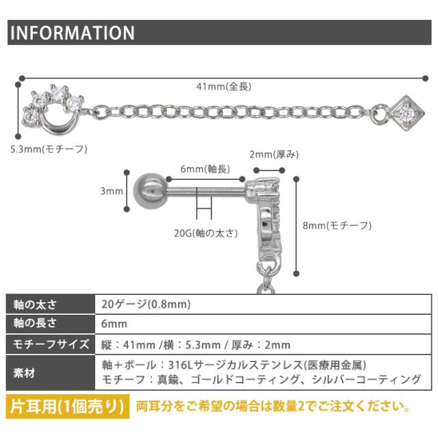上品なひかえめサイズに長いチェーンチャームがついたエレガントなストレートバーベル。 厚みがあってシンプルでも存在感があります。 太さは普通のピアスと同じ20Gなので、どなたでもお使いいただけます。 軸とボール部分はサージカルステンレス製ですが、モチーフは真鍮製ですので、アレルギーの強い方はお控えください。