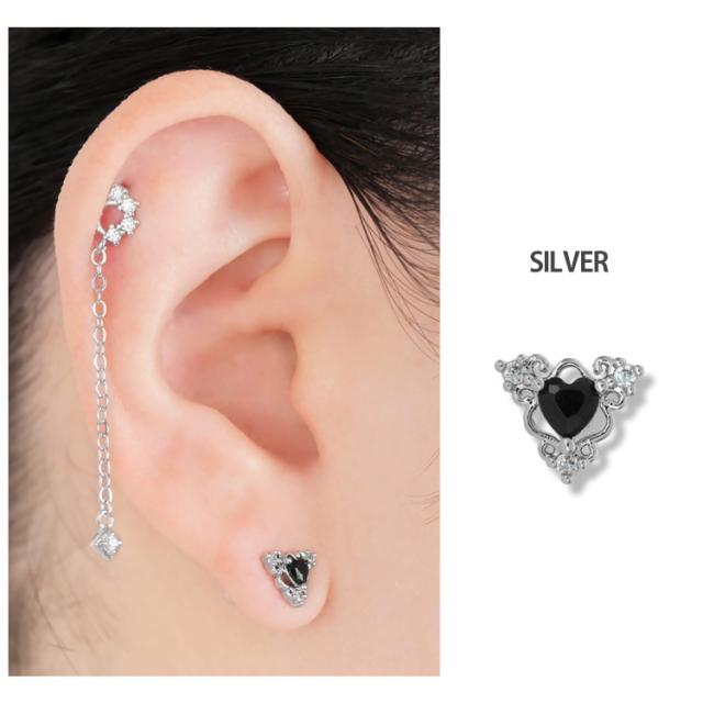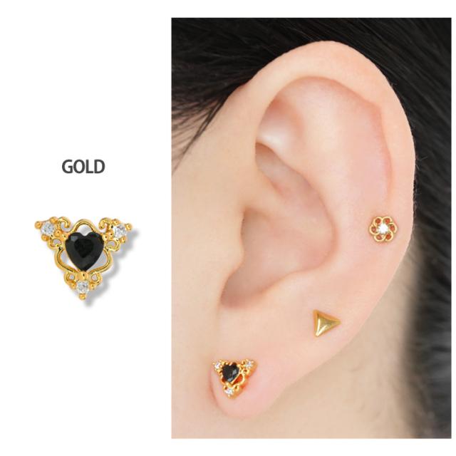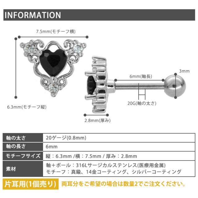 ブラックカラーのハートにゴシック調のフレームデザインが甘辛ミックスでおしゃれなストレートバーベル。 厚みがあってシンプルでも存在感があります。 太さは普通のピアスと同じ20Gなので、どなたでもお使いいただけます。 軸とボール部分はサージカルステンレス製ですが、モチーフは真鍮製ですので、アレルギーの強い方はお控えください。