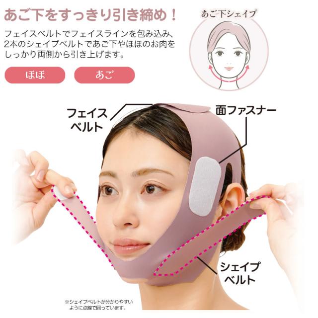 | ご使用方法 | ※パッケージ裏面を参考に向きを確認してください。 本品中央のシェイプベルトがない方がお肌に当たる面です。 ※ベルトがのどを圧迫しないように装着してください。 【1】あごをあご穴に当て、フェイスベルトを引き上げながら頭頂部でとめます。耳は耳抜き穴に合わせてください。 【2】シェイプベルトを耳横にある面ファスナーにとめ、2段階に引き締めます。本品のたるみ、歪みを整えてください。 |