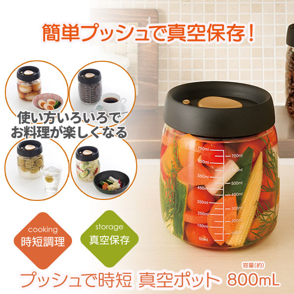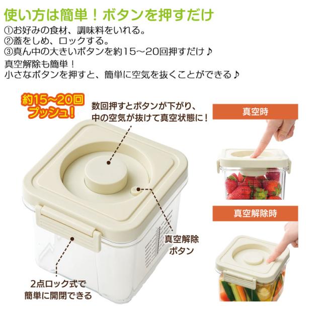 | ご使用方法 | 1.お好みの食材、調味料などを入れてふたをしめ、ロックしてください。※食材や液体がふた内側の真空ポンプ部の空気穴を塞がないようにしてください。 2.真空ボタン(真ん中の円形のボタン)を約15〜20回押せば、真空状態になります。※平らな場所で行ってください。 3.保管する場合は必ず平らな場所に置いて保管してください。 4.真空状態を解除する際は、真空解除ボタン(小さな丸いボタン)を押せばふたを開けることが出来ます。 |