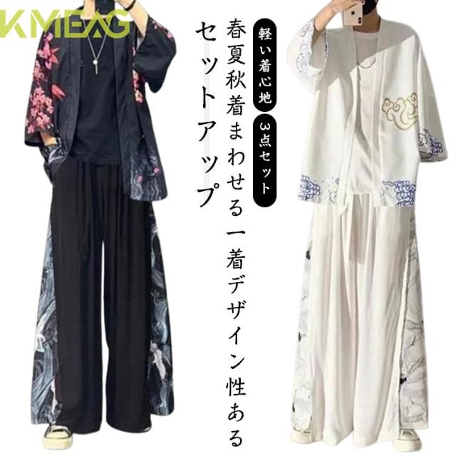 3点セット 羽織り 上下セット カーディガン 和柄 3点セット 袴パンツ メンズ スカート風 じんぺい スカーチョ セットアップ ワイドパンツ 浴衣 甚平 ハカマパンツ ゆったり フレアパンツ お兄系 ホスト ヴィジュアル系 袴 無地 モード系 個性派 ダンス 衣装