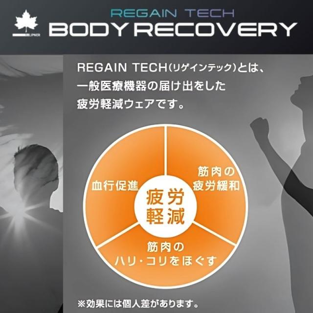 自らの体温による遠赤外線を輻射させる特殊繊維「リゲインテック」を使用し、着るだけで血流を促進し、全身の筋肉のハリ・コリをほぐし、疲労回復をサポート。