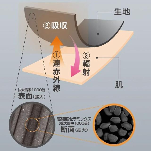 この特殊繊維が身体の内部から放出される遠赤外線(体温)を輻射することにより、全身の血流を促進し、体の疲労やコリを軽減。