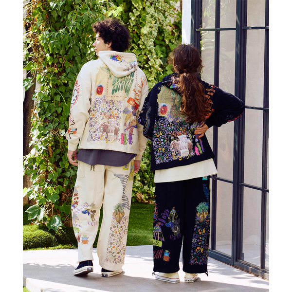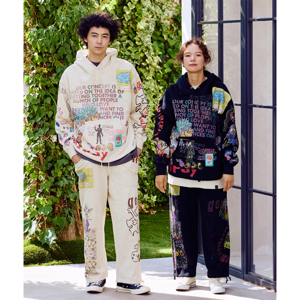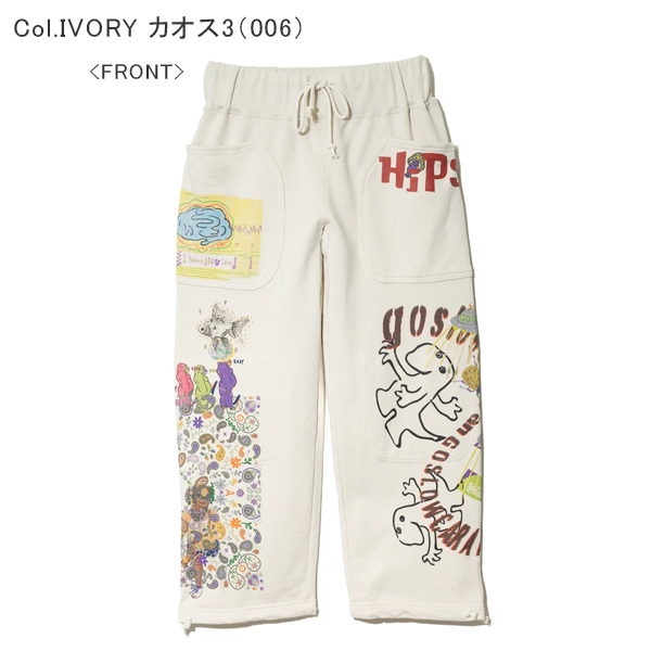 go slow caravanオリジナルで編み立てている《空紡糸裏毛シリーズ》 “go slow caravan”をテーマに、さまざまなイラストやモチーフをMIXし、 落書きのように散りばめたコラージュデザインが印象的なスウェットパンツ。 まるでアート作品のような、遊び心あふれるスペシャルな一本です。 外側に縫い目のない筒状仕立てで、ストレートシルエットのゆったりとした穿き心地。 同シリーズのヘムスピンドルBOXフーディーとのセットアップスタイルもおすすめです。 《空紡糸裏毛/HEAVY WEIGHT》 綿100%ヘビーウェイトの裏毛生地。 表は空紡糸らしいガシッとした肌触りでありながら、裏のパイル面には太い裏糸を使用しているので 空気を多く含みフワッと柔らかい着心地を実現。使い込むほどに風合いの増す生地。 クラシック感のある長めのリブや3本針で丈夫な縫製など こだわりのディテールも取り入れた長くご愛用いただけるアイテム達です。 | ||||||