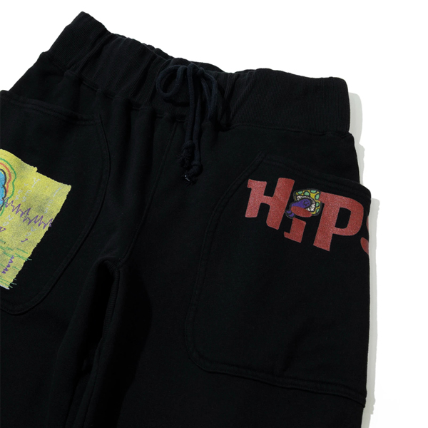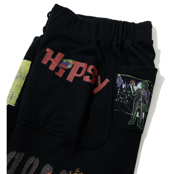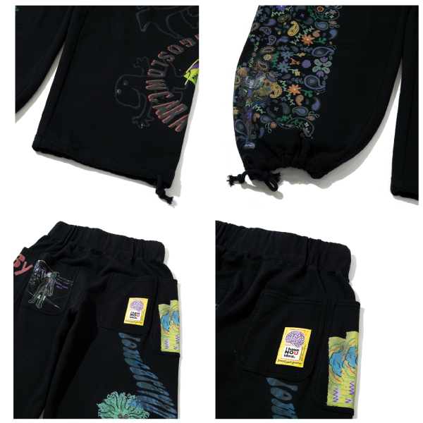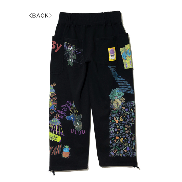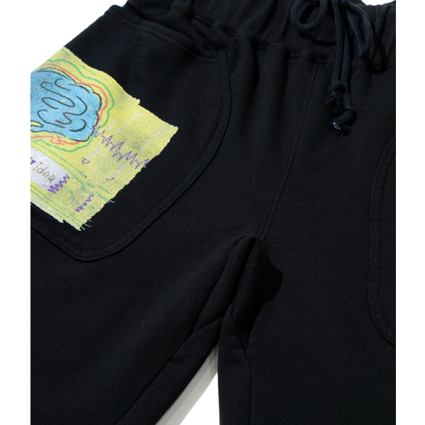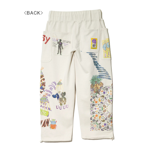 落書きのように散りばめたコラージュデザインが印象的なスウェットパンツ。