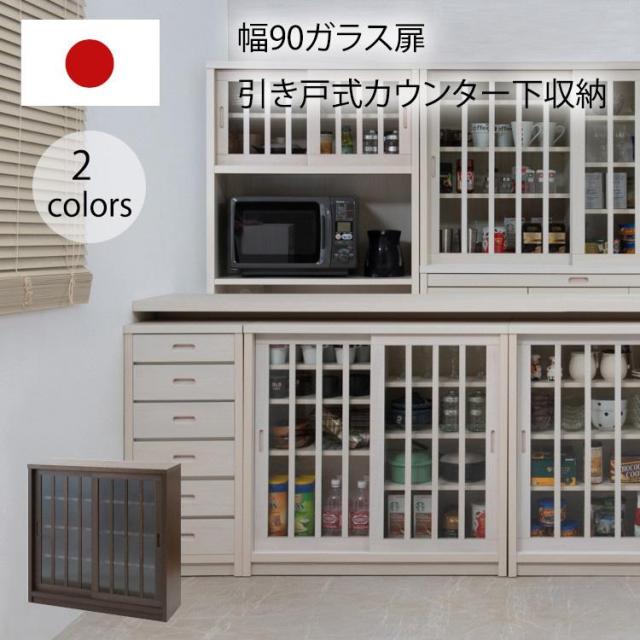 キャビネット 収納棚 引き戸 幅90 ガラス ガラス扉 おしゃれ カウンター下収納 カウンター 食器棚 ロータイプ 和モダン 日本製 完成品 大容量収納