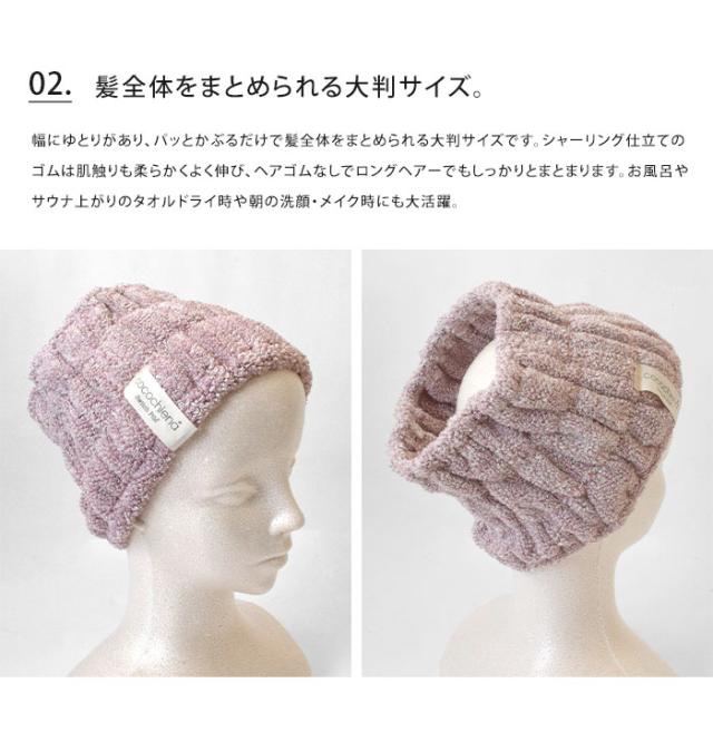 cocochienaシリーズからくすみカラーが可愛いヘアターバンが登場。 2色混合パイルによるナチュラルで温かい色味です。幅にゆとりがあり、パッとかぶるだけで髪全体をまとめられる大判サイズ。シャーリング仕立てのゴムは肌触りも柔らかくよく伸び、ヘアゴムなしでロングヘアーでもしっかりとまとまります。お風呂やサウナ上がりのタオルドライ時や朝の洗顔・メイク時にも大活躍。