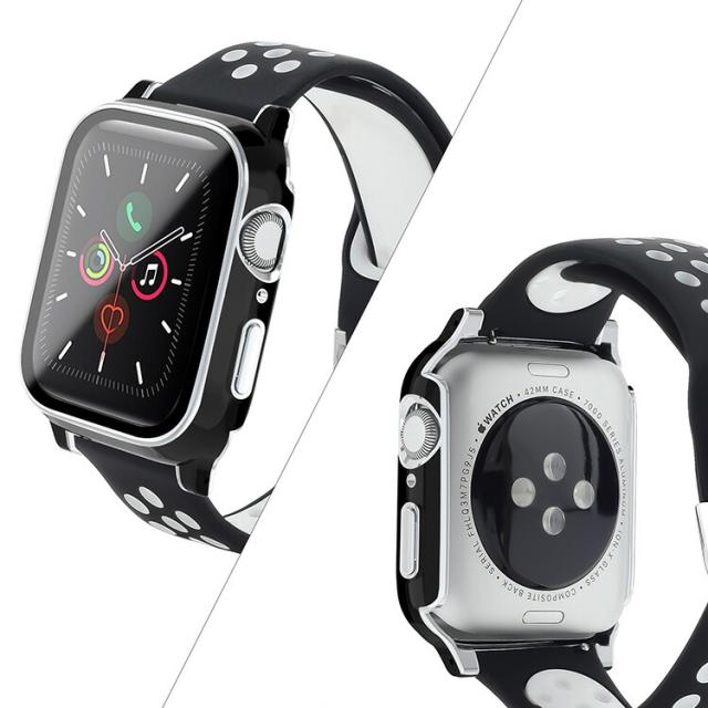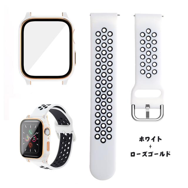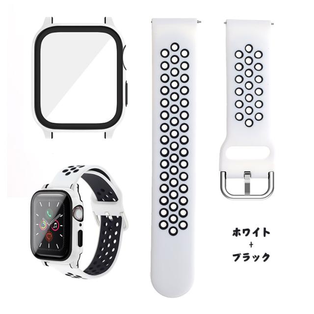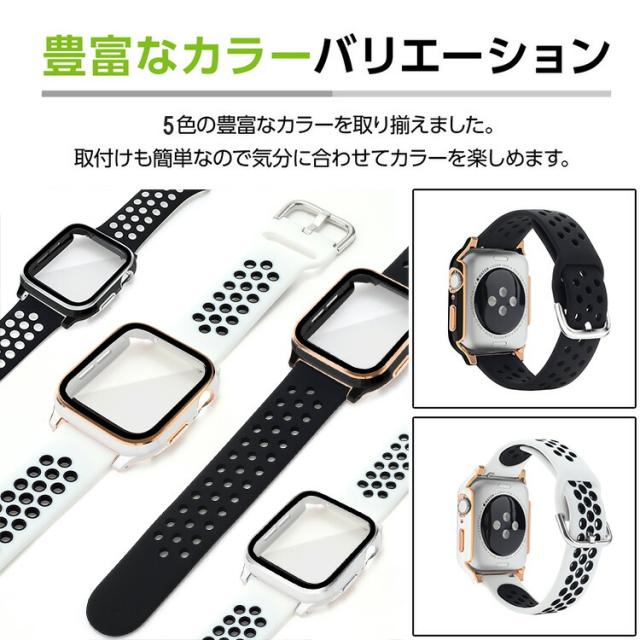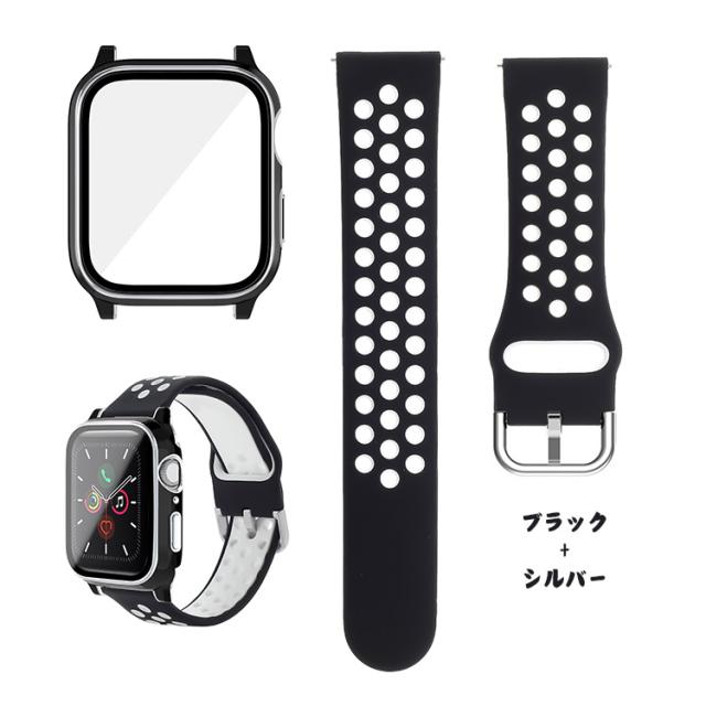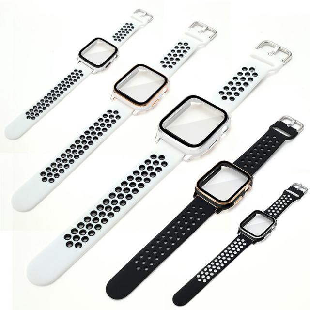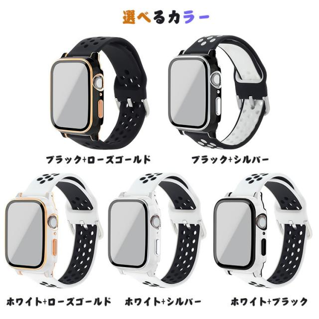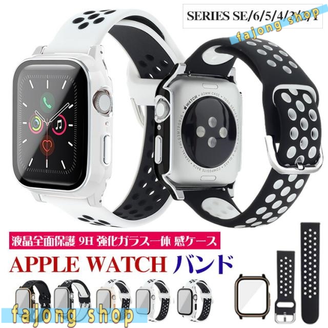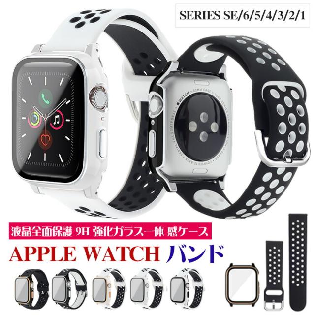 Apple watch バンド 9H強度ガラスケース付き 一体型 全面保護 スポーツベルト series6 5 4 3 2 1 se 通気性よい 44mm 40mm 38mm アップルウォッチ