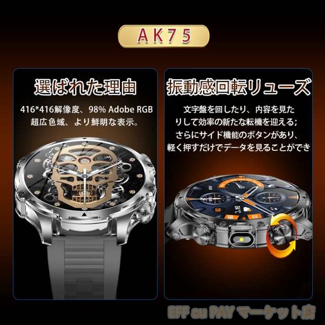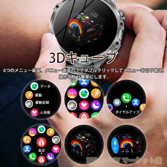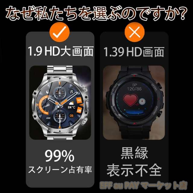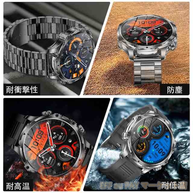 このスマートウォッチ 大画面は、CNC切削技術による鮮やかな質感と、輝きと奥行きを際立たせる特徴的な時計ベゼルのデザイン、繊細なラインが魅力です。更に、軍用様のボディには傷がつきにくく1.9インチHDのAMOLEDディスプレイ(416*416PPi)が組み込まれており、太陽光の40%を反射する性質があり、フレームなしのディスプレイで大きなフォントで屋外でも老眼の方でも情報やデータが見やすく表示されます。滑らかなタッチスクリーンと機械音の回転式リューズの双方で操作が可能です。美しさと実用性(耐熱性、耐衝撃性、耐水性)が見事に融合したこの高級でスタイリッシュな腕時計 メンズは、ビジネスシーンはもちろんプライベートシーンでも活躍いたします。洗練されたデザインと優れた機能性で、ぜひご検討いただきたい逸品です。
