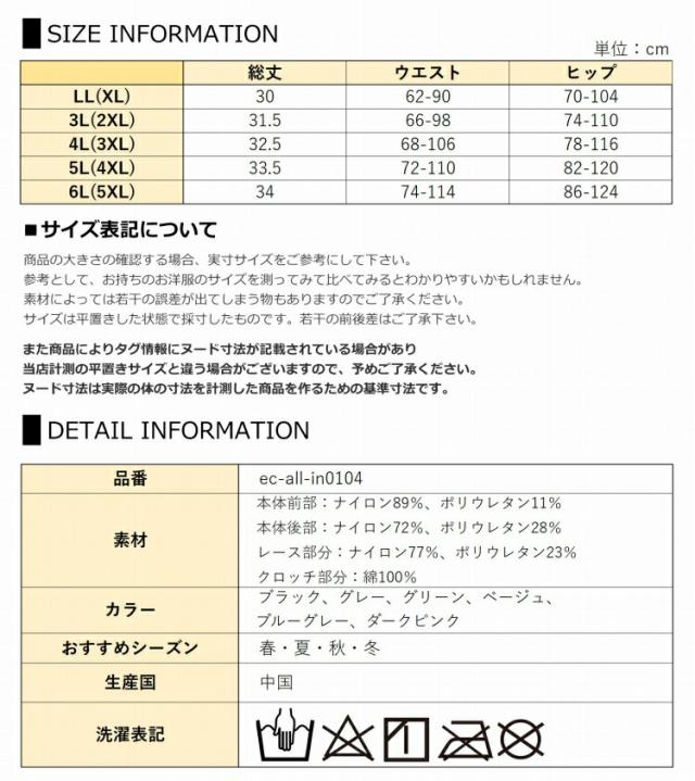 | 素材 | 本体前部:ナイロン89%、ポリウレタン11% 本体後部:ナイロン72%、ポリウレタン28% レース部分:ナイロン77%、ポリウレタン23% クロッチ部分:綿100% |