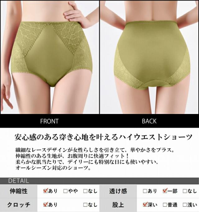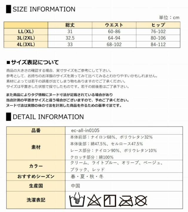 | 素材 | 本体前部:ナイロン68%、ポリウレタン32% 本体後部:綿47.5%、セルロース47.5% レース部分:ナイロン90%、ポリウレタン10% クロッチ部分:綿100% |