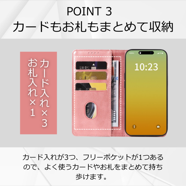 収納:カードポケット×3、紙幣やレシートが入るフリーポケット×1