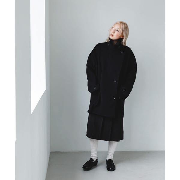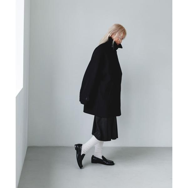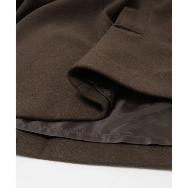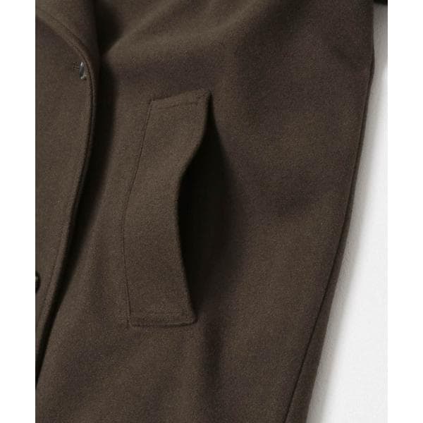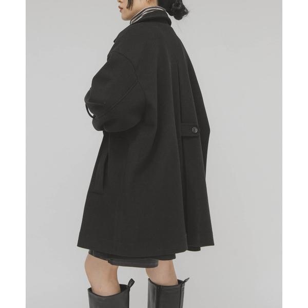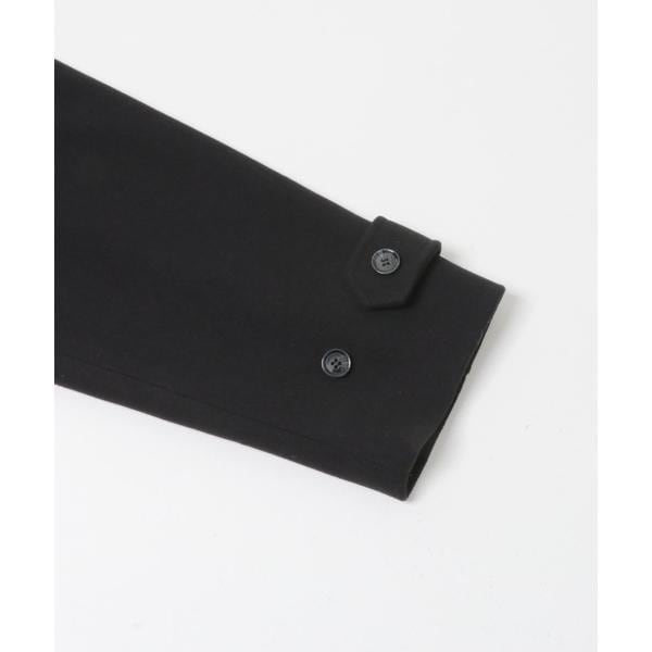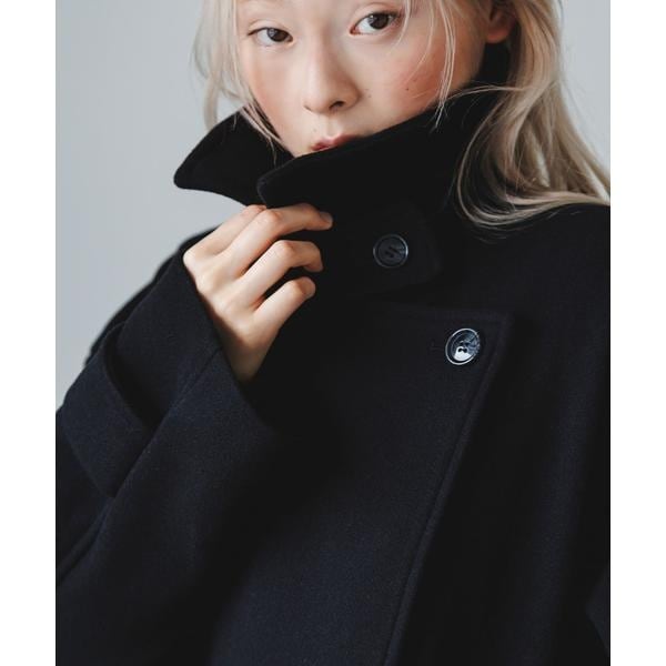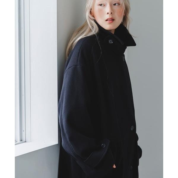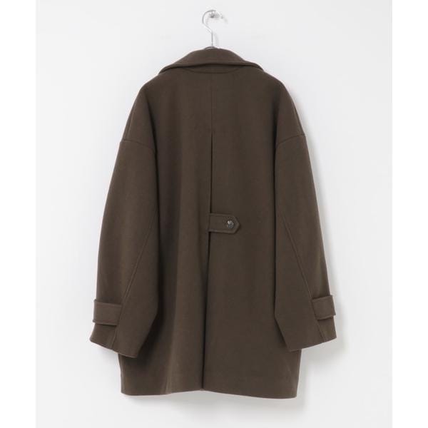BIGカラー仕様が顔周りを華やかに仕上げるアウター。衿に釦が設定されているので、スタンドカラーとしても着用可能です。また、後ろに大きなタックが入っており、ウエストのタブもポイントになっています。袖は調整可能な釦付きになっており、小さくすると少し丸みが出ます。程よくリラックスしたシルエットと、腰回りがカバーできる絶妙な丈感は、パンツやスカートどちらにも合わせやすいです。