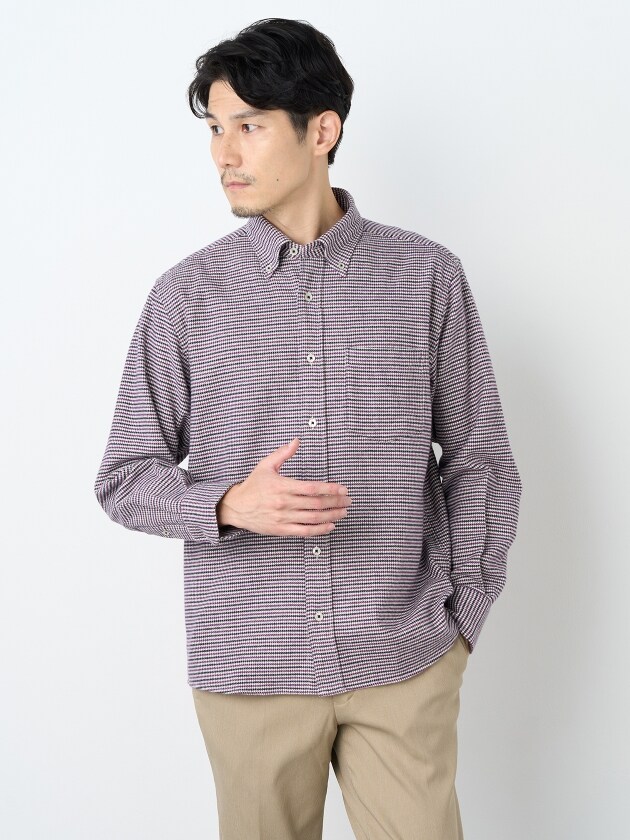 やわらかな風合いが魅力のコットン起毛生地のボタンダウンシャツ。日本有数の先染め生地産地である播州地区のジャパンファブリックを使用。2色使いの千鳥柄がトラディショナルな雰囲気を醸し出す紳士的な1着。無地調でウーリーなアイテムとの着合わせが上品でお薦め。アウター代わりに羽織ることが出来る生地感で、初冬は軽いアウター代わりに、真冬には暖かなインナーとして使用することができる汎用性も魅力的なポイント。